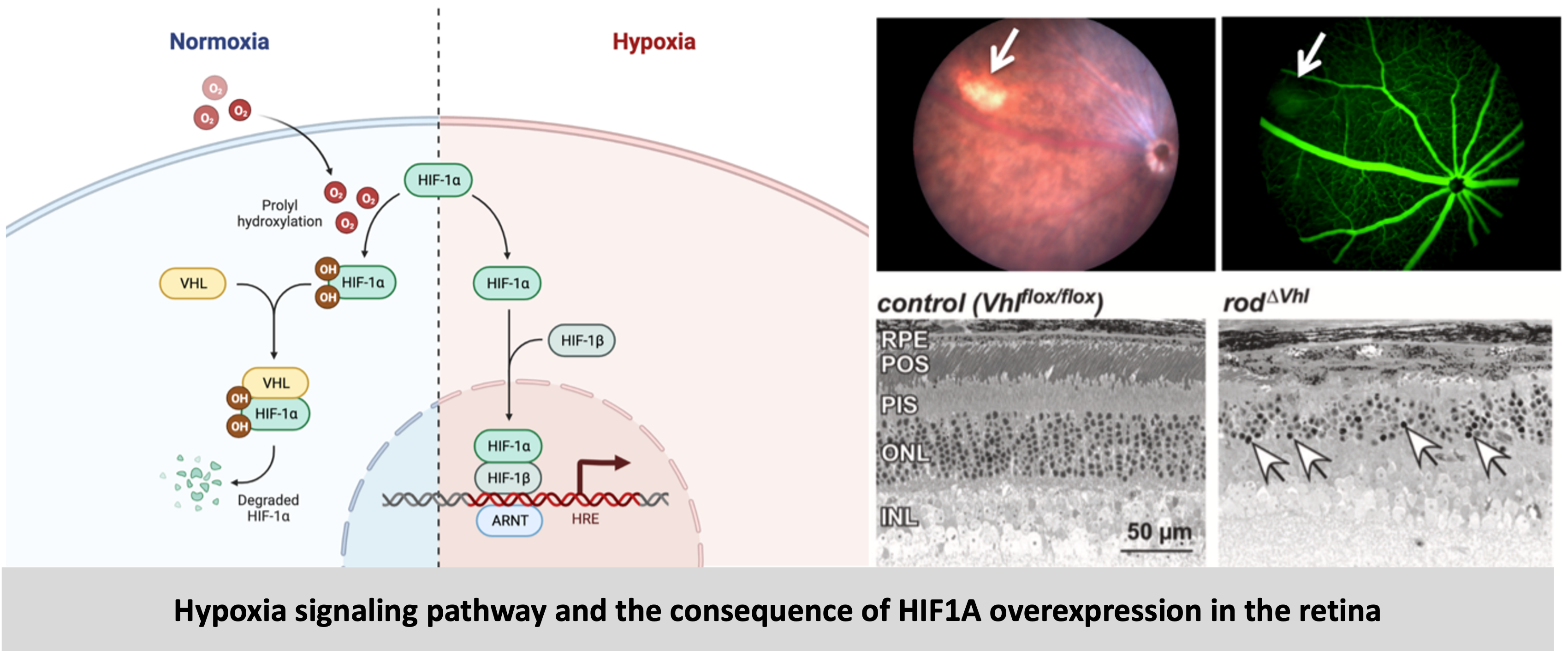The retina is a metabolically active tissue with high oxygen demand. Age-related changes in the retina can result in reduced oxygen supply (hypoxia) to the retina. Hypoxic stress in the retina occurs when oxygen supply is insufficient to meet the metabolic demands of retinal cells. This mild but chronic hypoxia results in cellular stress and eventual death of retinal cells leading to degeneration. At the cellular level the hypoxic response is mainly executed by transcription factors called – hypoxia inducible factors (HIFs). In this project, by using genetic mouse models, we aimed to understand the role of hypoxia pathways and more specifically HIFs in age-related retinal degeneration. So, we generated mouse models with rod photoreceptor-specific overexpression or knockdown of the transcription factors HIF1A and HIF2A. Upon characterization of these mice, we showed that overexpression of HIF1A resulted in loss of photoreceptors which led to retinal degeneration. In mice with HIF1A knockdown, this phenotype was rescued. To analyze molecular and cellular changes we compared the transcriptomes of retinas when HIF1A is overexpressed or deleted in the rods, which revealed the differential regulation of several genes. Based on the groups of differentially regulated genes identified, we focused our analysis on two important mechanisms – metabolism and immune response (complement pathway). In HIF1A stabilized mice there was an upregulation of complement factors, however upon further analysis we concluded that the complement factors are not direct targets of HIF1A and are most likely upregulated as part of ongoing degeneration mechanisms in these mice. We also showed that HIF1A stabilization resulted in a metabolic shift from oxidative phosphorylation to glycolysis. Lastly, the knockdown of Hif1a in the hypoxic retina, by subretinal injections of Adeno-associated viruses (AAVs) packaging shRNA against Hif1a was envisioned as a gene therapy for combating degeneration.